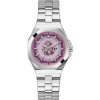 Cadranul roz adaugă o notă feminină și rafinată, completându-se armonios cu brățara argintie, tot din oțel inoxidabil. Acest contrast subtil dintre culorile roz și argintiu creează un efect vizual plăcut și versatil, potrivit pentru orice ocazie, de la întâlniri de afaceri la evenimente formale.