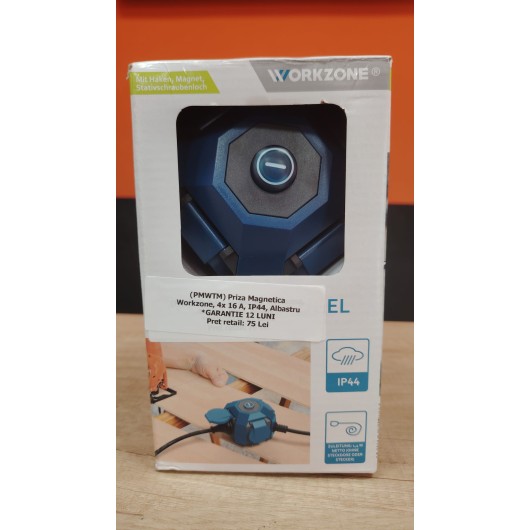 Priza Magnetică Workzone, 4x16A, IP44, albastră, este o priză robustă și rezistentă la apă, ideală pentru utilizare în medii de lucru solicitante. Datorită montajului magnetic, se fixează ușor pe suprafe metalice, oferind o soluție practică și sigură pentru alimentarea simultană a mai multor echipamente electrice.