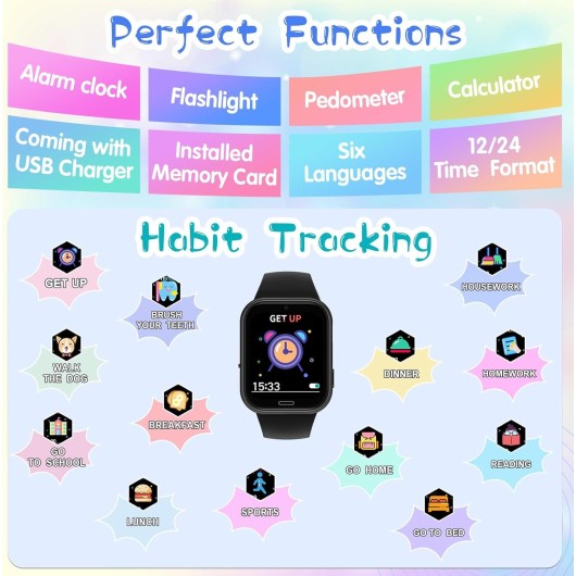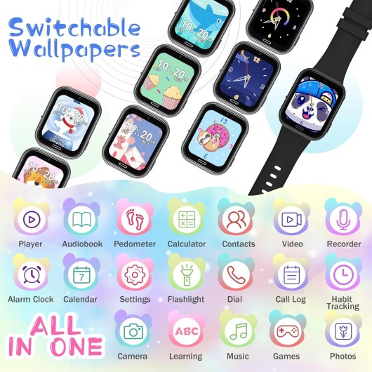 CATGIFF Children's Smartwatch este partenerul ideal pentru aventurile zilnice ale copiilor cu vârste cuprinse între 4 și 10 ani. Acest smartwatch de culoare neagră, conceput special pentru copii, combină divertismentul cu funcționalitatea esențială, asigurându-se că cei mici sunt mereu în siguranță și conectați. Cu o serie de funcții educative și de siguranță, acest ceas inteligent îndeplinește nevoile atât ale celor mici, cât și ale părinților.
